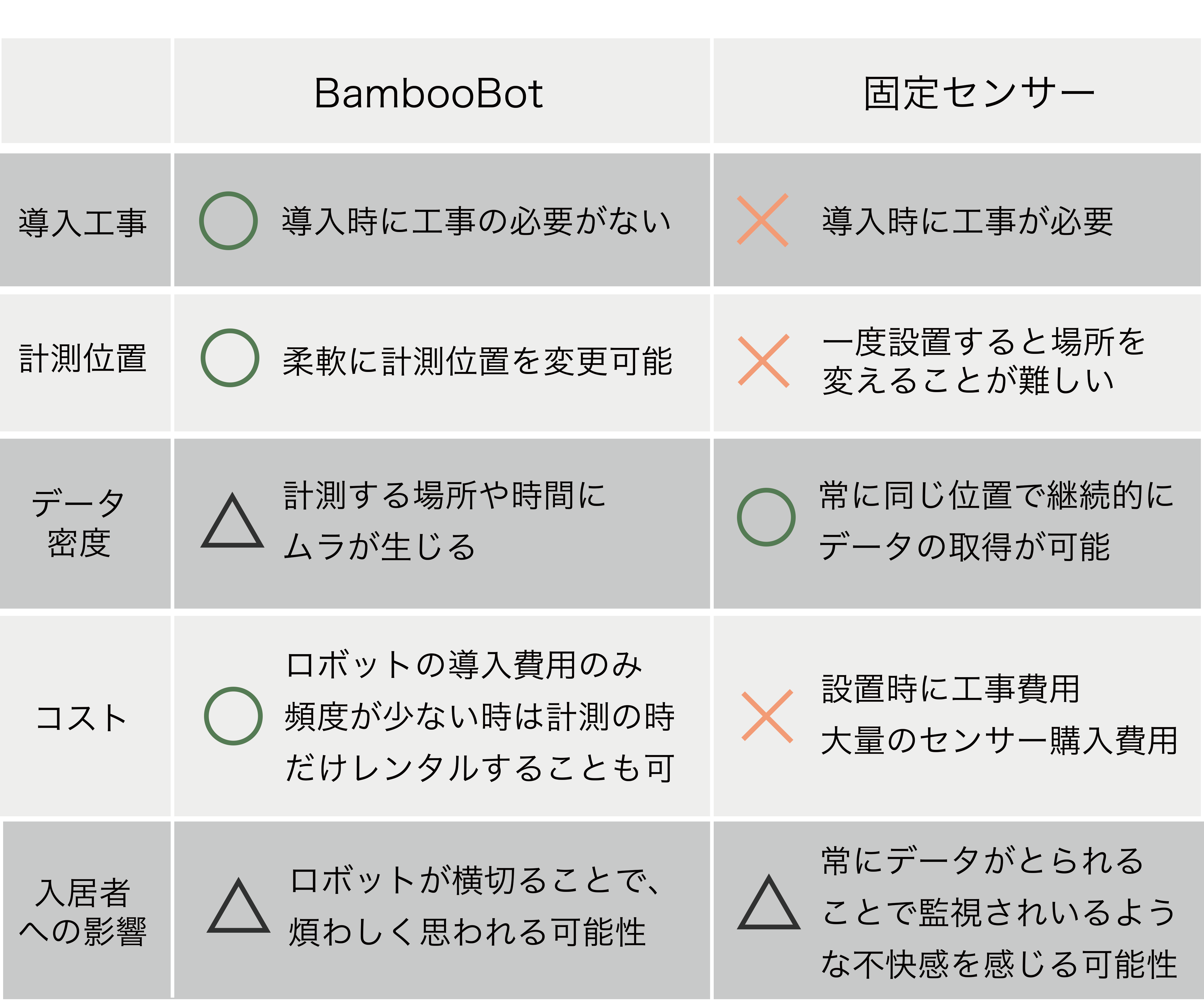 固定センサーは設置する際に工事が必要であったり、大量のセンサーを購入する必要があり、ロボット1台だけ用意すれば良いBambooBotの方がコストパフォーマンスに優れています。