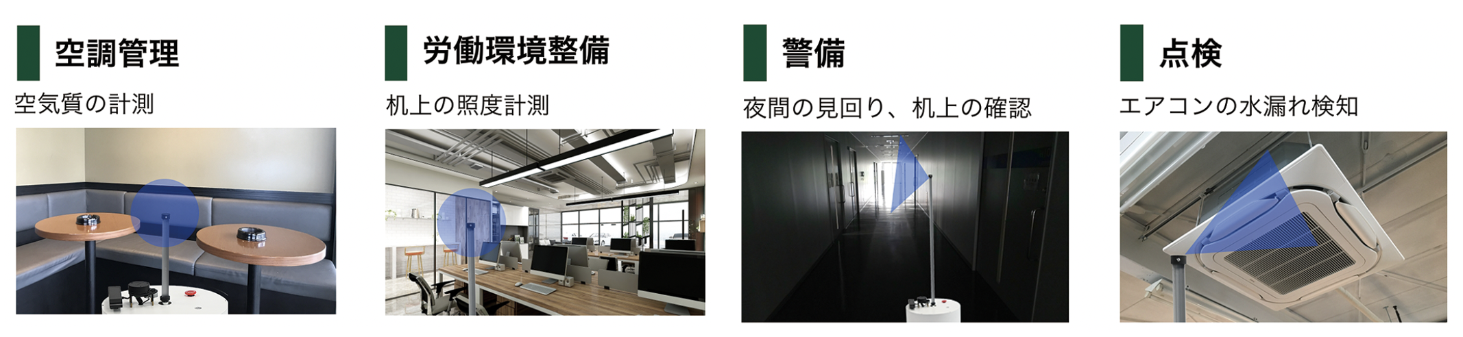 電灯の照度計測、休憩スペースの空気質の計測、エアコンの水漏れ検知など、センサーやカメラを上下させながら、設備点検をして回ることが可能です。